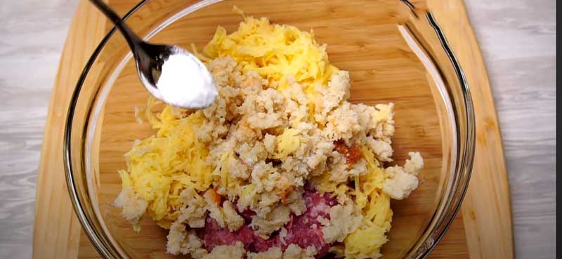 Într-un castron, puneți 500 de grame de carne tocată, adăugați ceapa cu usturoiul, cartofii, stoarceți apa din pâine și adăugați-o la carne, framântând-o cu mâinile.