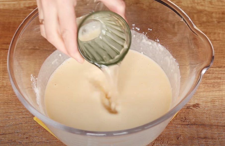 PAȘUL 4: adăugați apa clocotită și amestecați rapid. Aluatul va fi lichid, așa trebuie să fie. Lăsați-l să stea timp de 20 de minute pentru ca glutenul să se hidrateze, iar clătitele să devină și mai elastice și să nu se rupă la întoarcere.